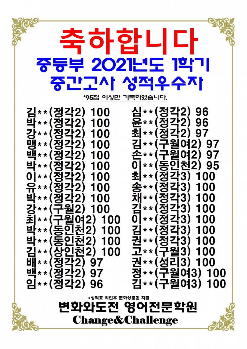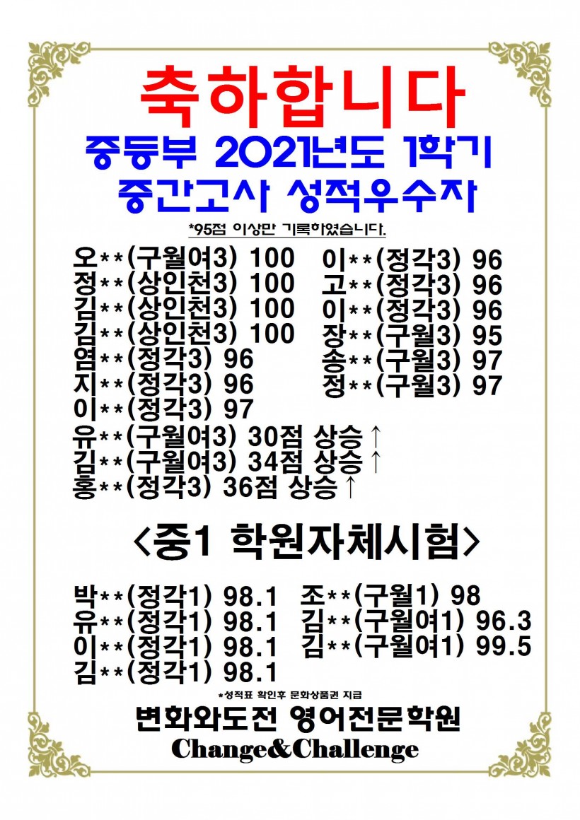 [중등부] 2021년도 1학기 중간고사 성적우수자