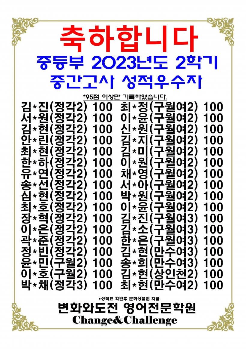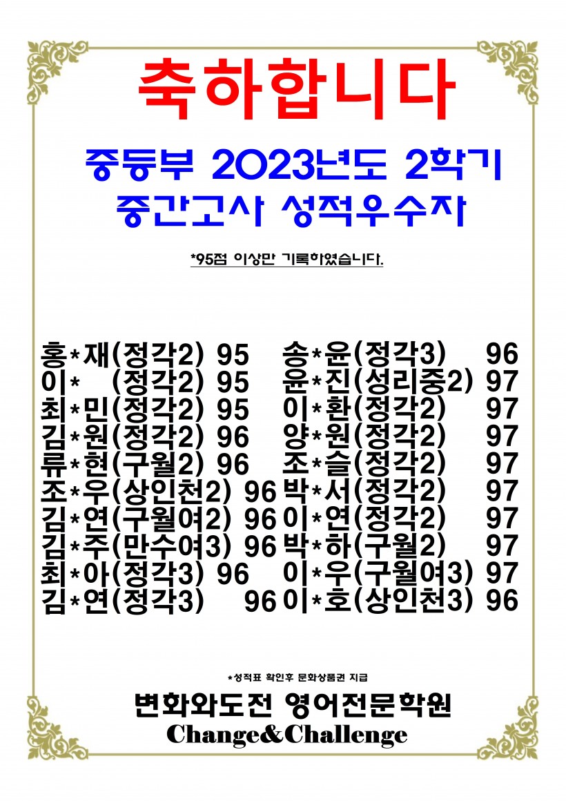 [중등부] 2023년도 2학기 중간고사 성적우수자