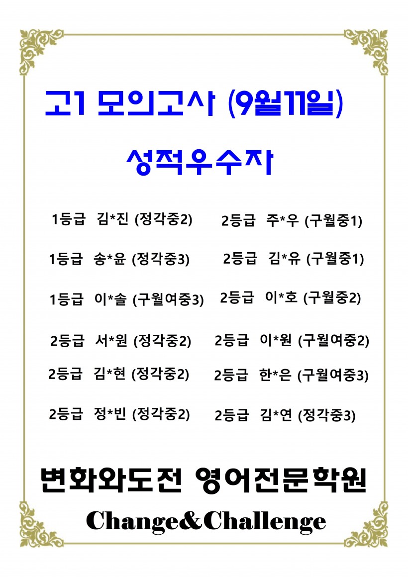[본관] 고1 모의고사 우수자(9월11일)