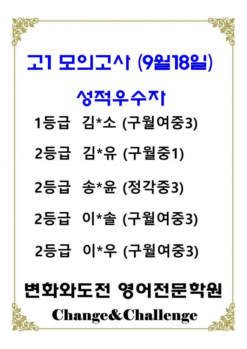 [본관] 고1 모의고사 우수자(9월18일)