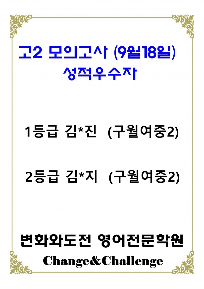 [본관] 고2 모의고사 우수자(9월18일)