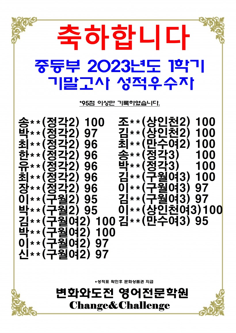 [중등부] 2023년도 1학기 기말고사 성적우수자