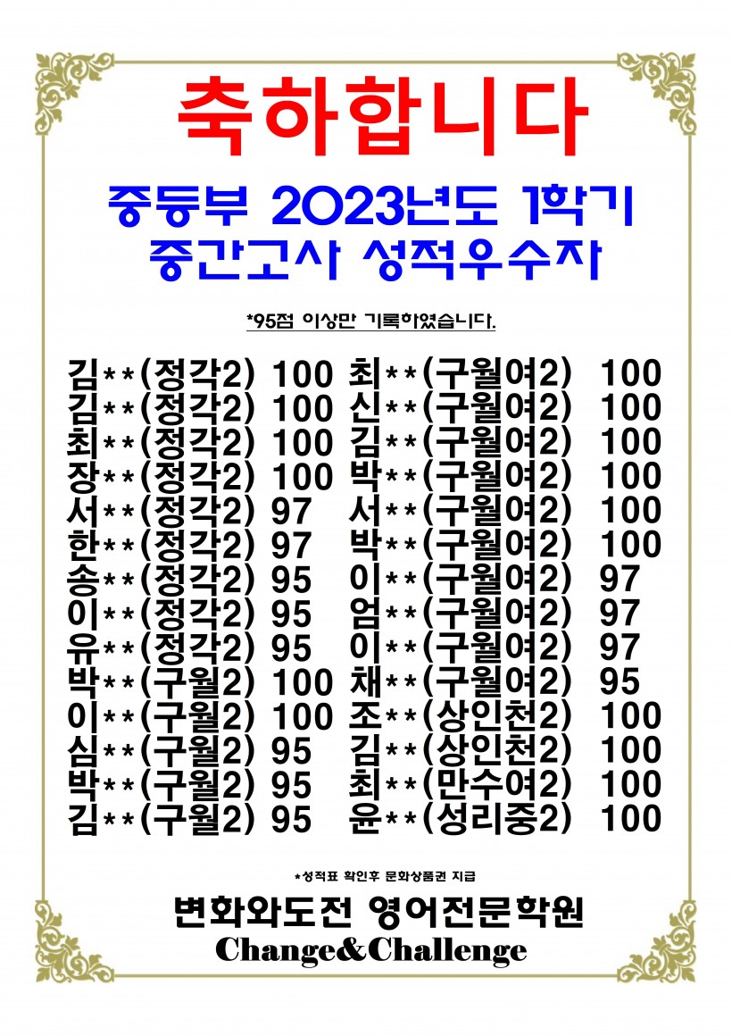 [중등부] 2023년도 1학기 중간고사 성적우수자