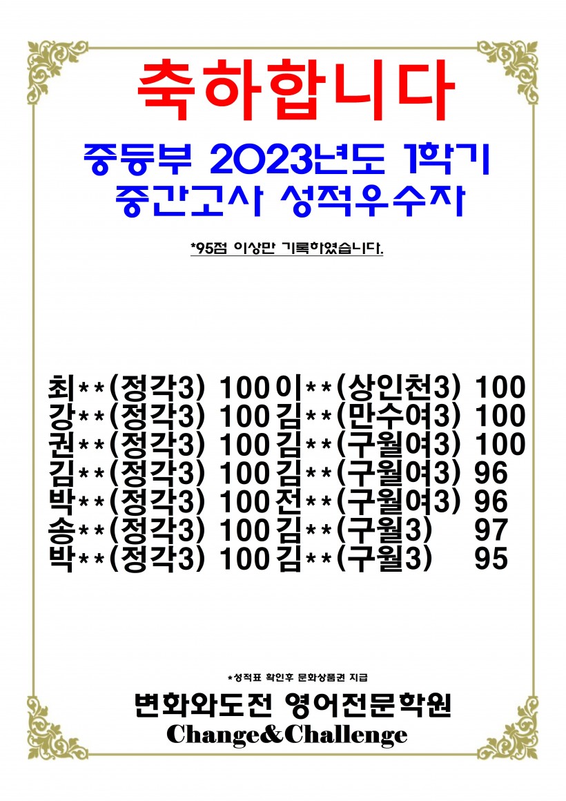 [중등부] 2023년도 1학기 중간고사 성적우수자 -1