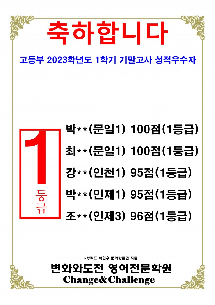[별관] 2023년 고등부 1학기 기말성적 우수자